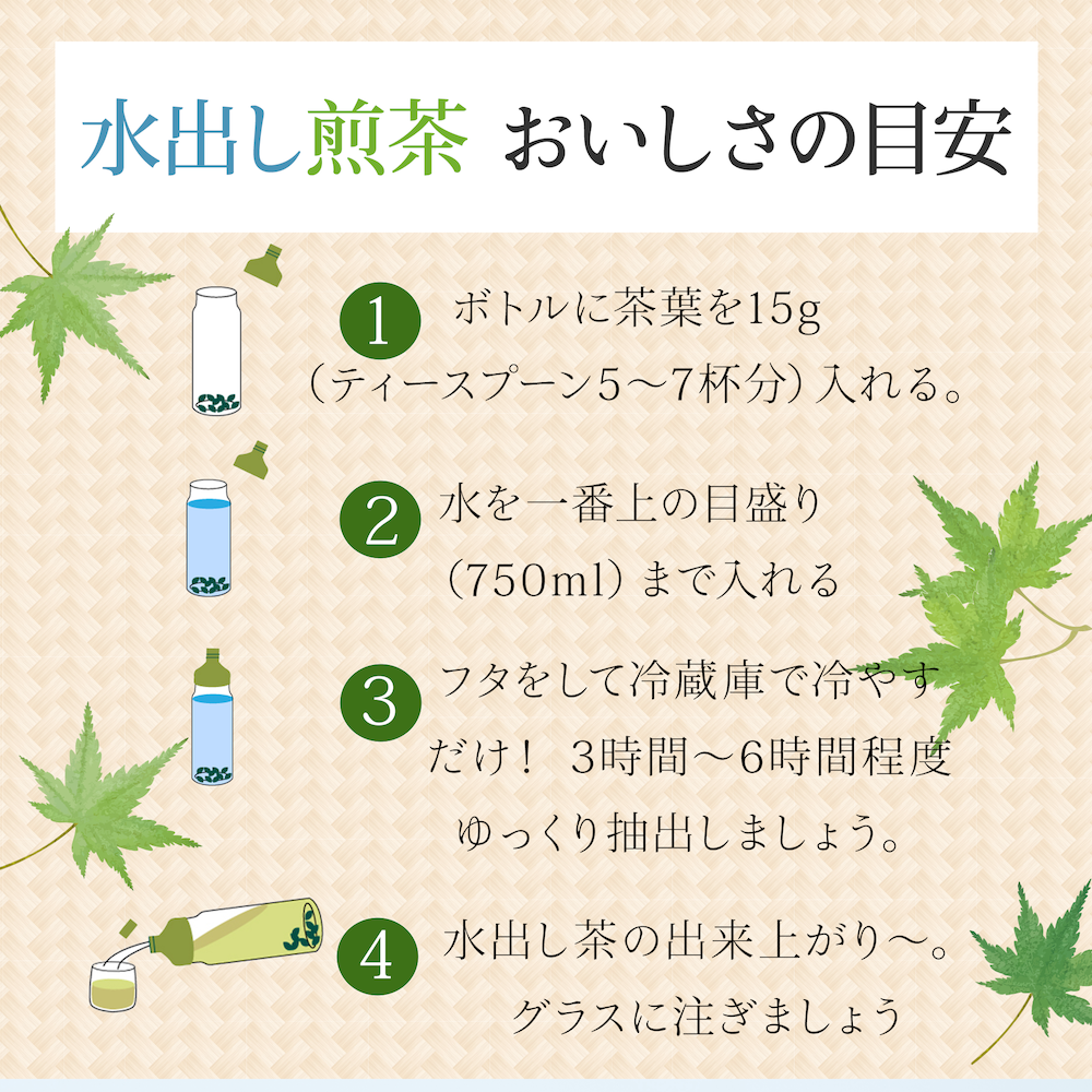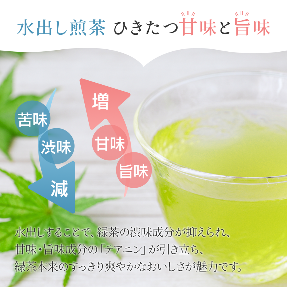 暑い夏も爽やかに、冷やした水出し煎茶で気持ちもリフレッシュ!石臼挽きされた宇治抹茶を使用した、香り高く深い味わいが特徴の煎茶です。水出しで手軽に楽しめ、煮出す手間が省けるため、忙しい朝やリラックスしたい夕方にも最適です。