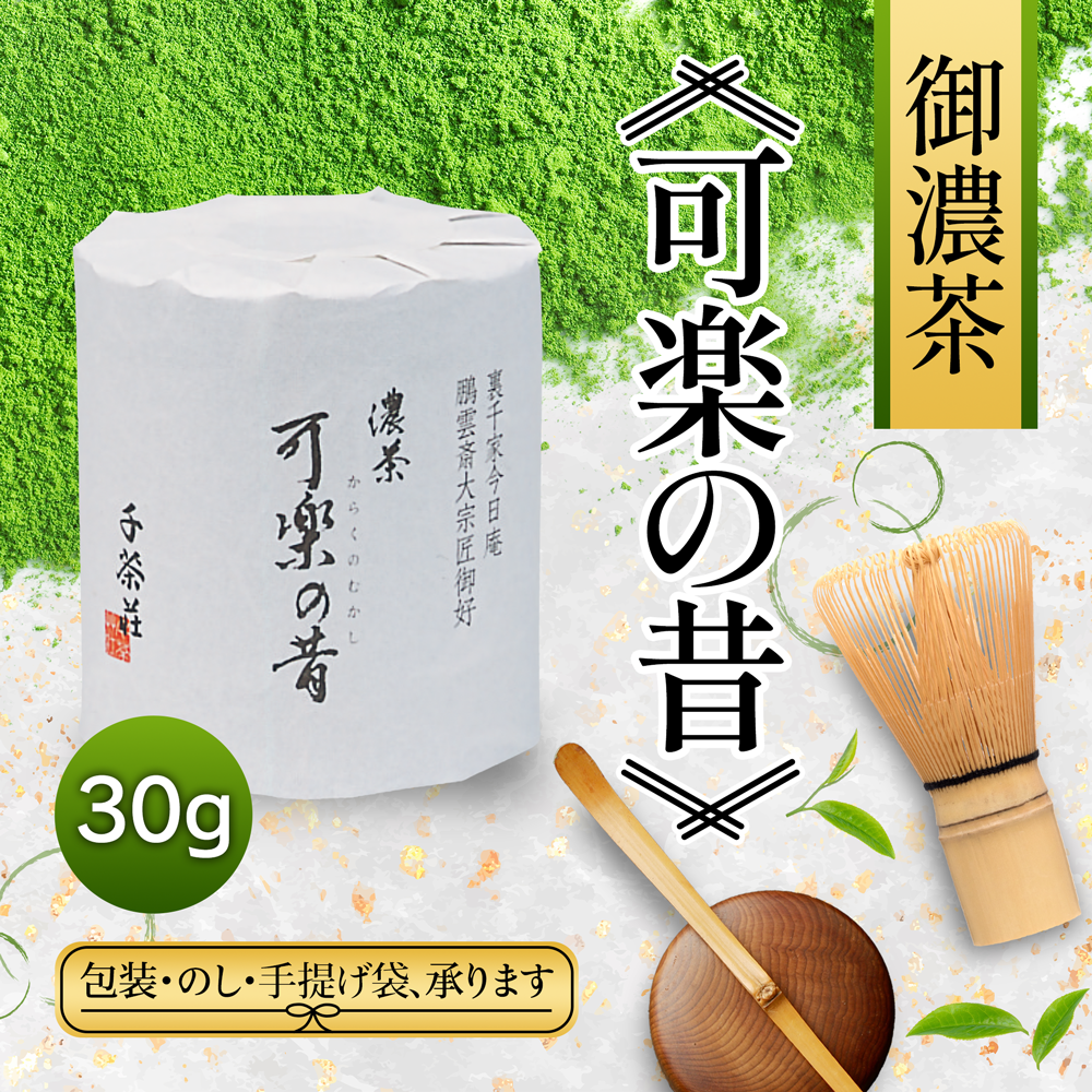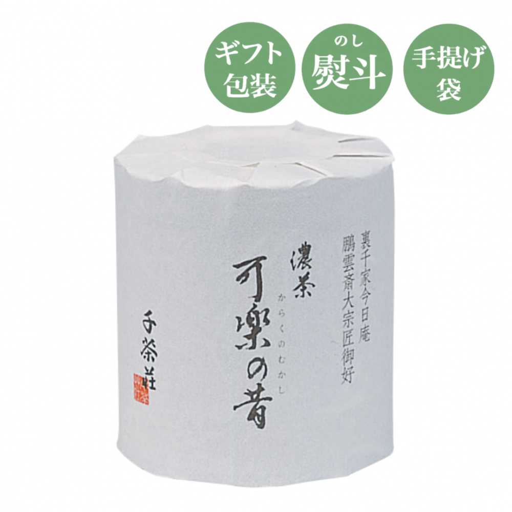 千茶荘の「御濃茶 可楽の昔」は、高級抹茶の中でもひと際輝く逸品です。品質の高さは一目瞭然で、その味わいもまた格別。口に含むと極上の香りと濃厚な旨味が広がり、心地よい苦みが後を引きます。
