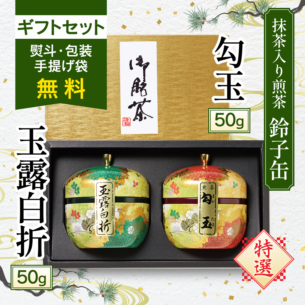 玉露白折、勾玉をかわいらしいお茶缶入りました。 ・抹茶入り煎茶 玉露白折(50g) ・抹茶入り煎茶> 勾玉 (50g) ■箱サイズ: L138mmxW240mmxH87mm